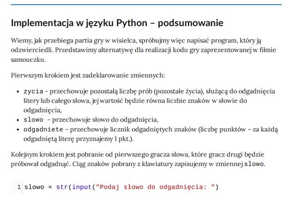 1. Praca z multimedium. Nauczyciel wyświetla zawartość sekcji „Film samouczek”. Na forum klasy uczniowie analizują przedstawioną w niej implementację gry w wisielca w języku Python